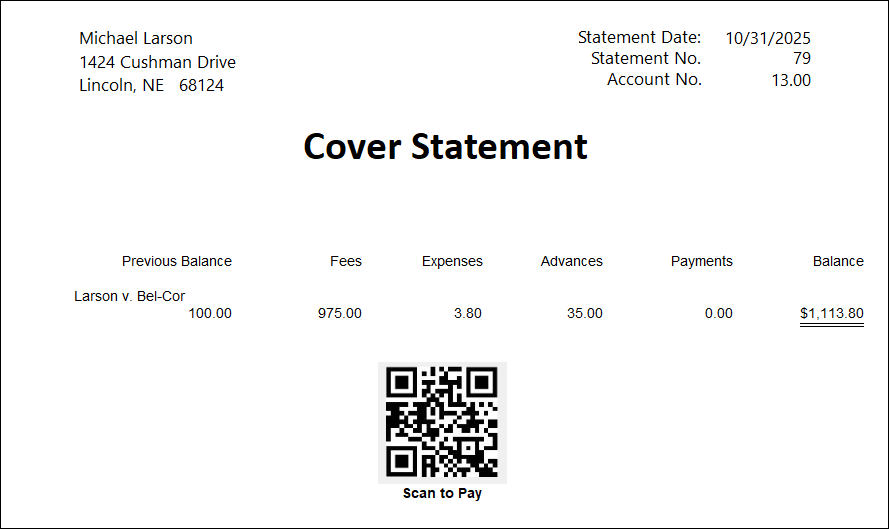 QR codes can also be included when reprinting a single updated statement. This makes it easy to re-send a statement to a client and allow them to make a payment online.
