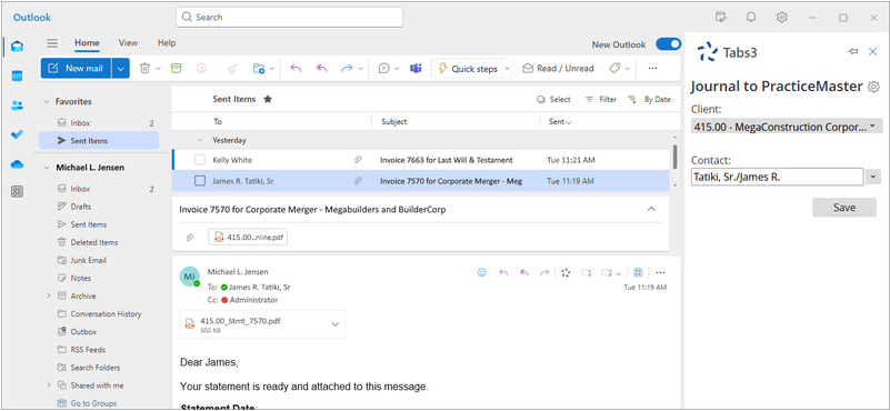 The Tabs3 Outlook Add-in requires users to log in with their Tabs3 Connect account. Once logged in, the Tabs3 pane in Outlook allows you to specify the Client and/or Contact and create a Journal record based on the email. Email that has been journaled will display the client and contact information.