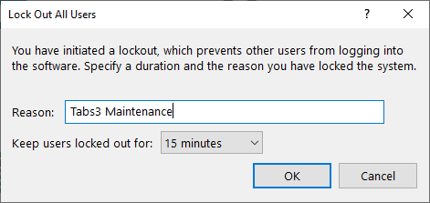 When initiating a lockout, you can exit the software to perform server maintenance tasks, such as external backups, server moves, etc., without worrying about users opening the software. The user performing the lockout will continue to have full access to the Tabs3 Software, including applications that were closed prior to the lockout.