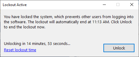 Lockouts can be assigned an optional duration. Once the assigned duration has expired, the lockout is automatically lifted and users can begin using the software again. If you need additional time to complete your tasks, the lockout can be extended. In the event a lockout must be ended early and the user who initiated it is unavailable, another user with manager rights can override the lockout.