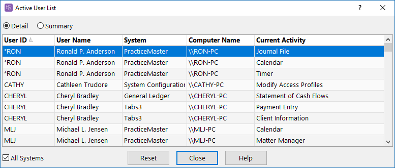 When opening the Active User List, a window is displayed with all users who are in the currently open software (e.g., if you open the Active User List from PracticeMaster, users in PracticeMaster will be displayed). Additionally, you can see which computer they are logged into, and which file they are accessing in the software. Manager users will also have an All Systems check box and a Reset button. When the All Systems check box is selected, all users in all applications will be listed. The Reset button allows managers to reset a user, which closes the software on that user’s computer. (Note: Resetting users is not recommended in most situations, and should only be used when the user in question is not in the software.)